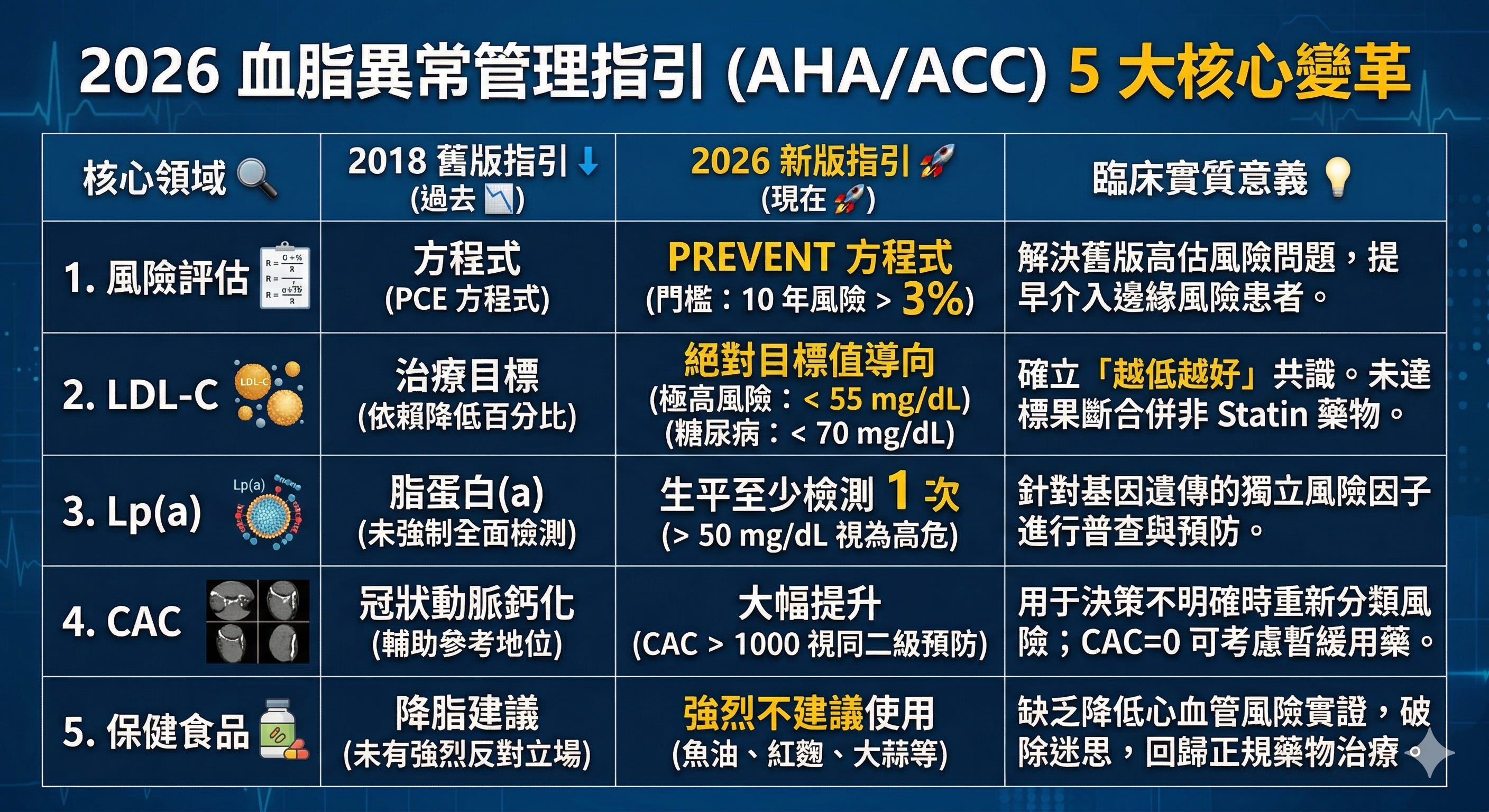 最新的國際醫學指引(ACC/AHA 2026)已正式發布,宣告了血脂管理進入「精準醫療」與「早期介入」的新紀元。對於追求頂級健康的人士,這份報告揭示了幾個關鍵轉變,預防動脈粥狀硬化性心血管疾病可以走得很前面。